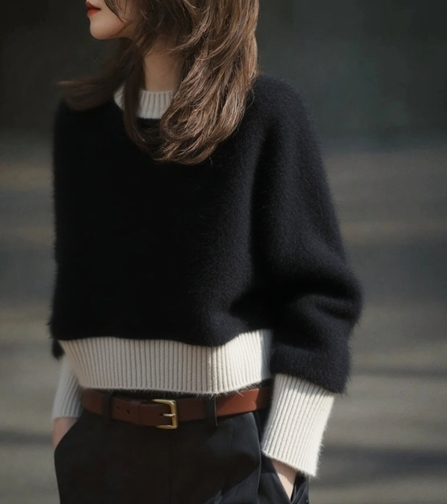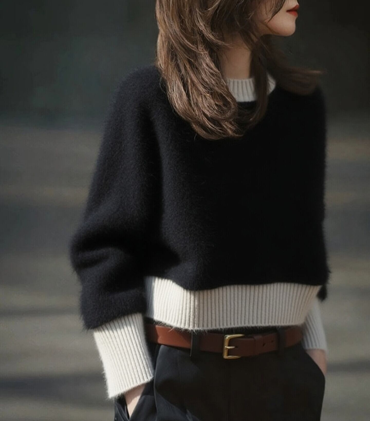 Bicolor Cropped Long Sleeve Pullover Knit A25122