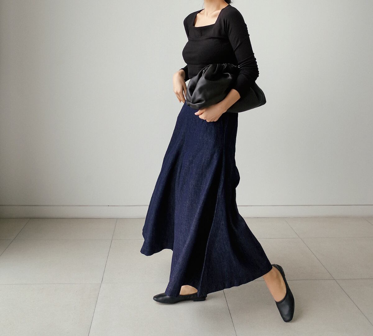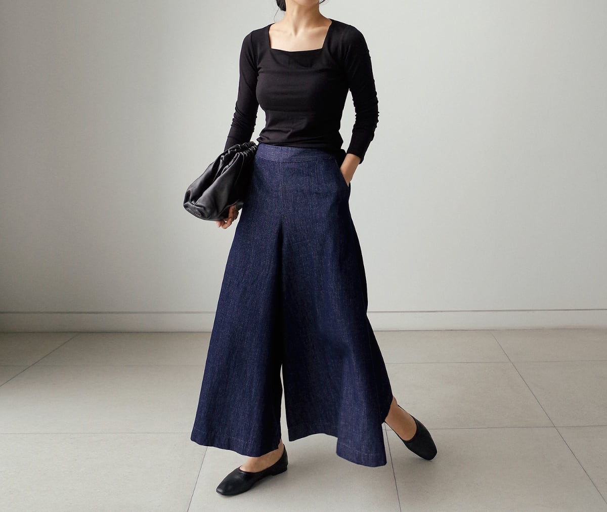 コンパクトでシンプルなトップスと合わせるだけで、